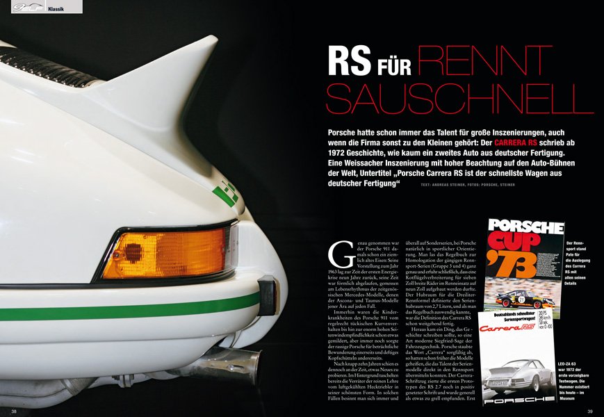 Magazin für Porsche-EnthusiastenVor 40 Jahren baute Porsche die ersten 500 Stück des legendären RS,um das Auto für den Rennsport zu homologieren. Damals ein alltagstauglicher Rennsport-Wagen, heute eine kostspielige Sammler-Rarität. Wir zollen dem RS Respekt, indem wir die wahre Geschichte erzählen und von der rauschenden Geburtstagsfeier beim RS Worldmeeting berichten. Weitere Themen:Test & Technik