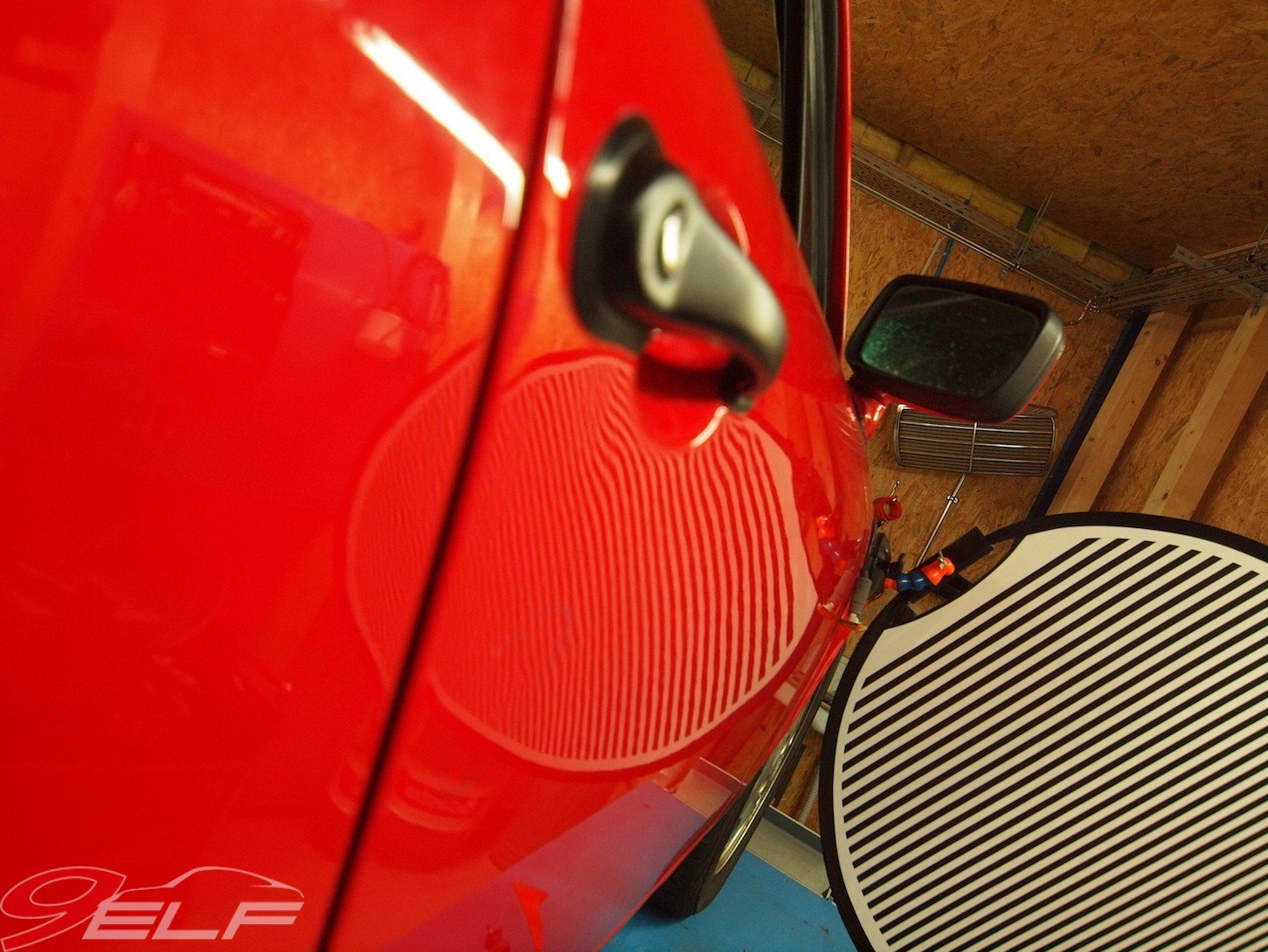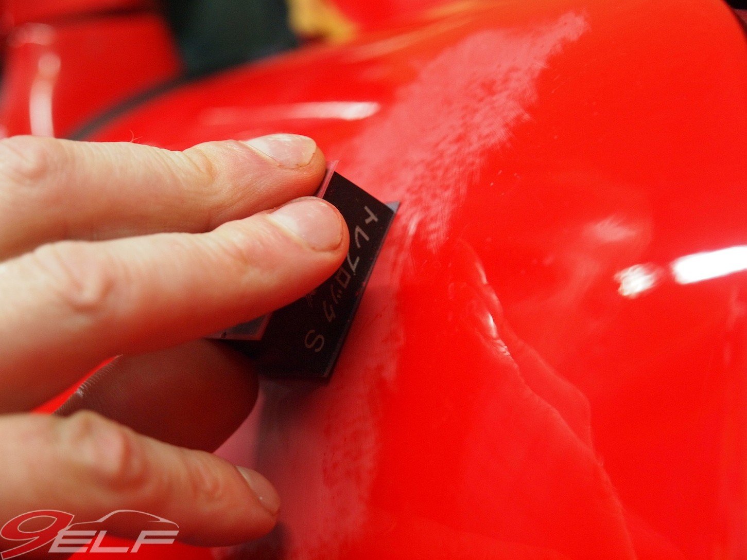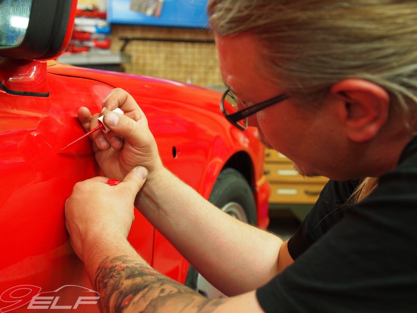 „Die meisten Leute lackieren viel zu früh“, erzählt mir Inhaber Sönke Hoffmann bei unserem ersten Gespräch auf dem Hof seiner Werkstatt. Einen ordentlichen Pflegezustand meines roten Elfers bestätigte Hoffmann zunächst, um seine Aussage nach der genaueren Begutachtung allerdings zu relativieren. „Auch an diesem Fahrzeug sind die im Laufe der Jahre entstandenen typischen Gebrauchsspuren zu sehen, die auch durch falsche Pflege entstanden sind“, so Hoffmann. Also Verwitterungen und Mattierungen an allen Oberflächen, Vermilchungen im Lack, mäßiger Glanz. Und überall ließen sich darüber hinaus die „Spuren der Stadt“, also leichte Dellen sowie Steinschläge finden und zudem gäbe sich die Kunststoff-Heckscheibe des Stoffdaches überaus verwittert und undurchsichtig.