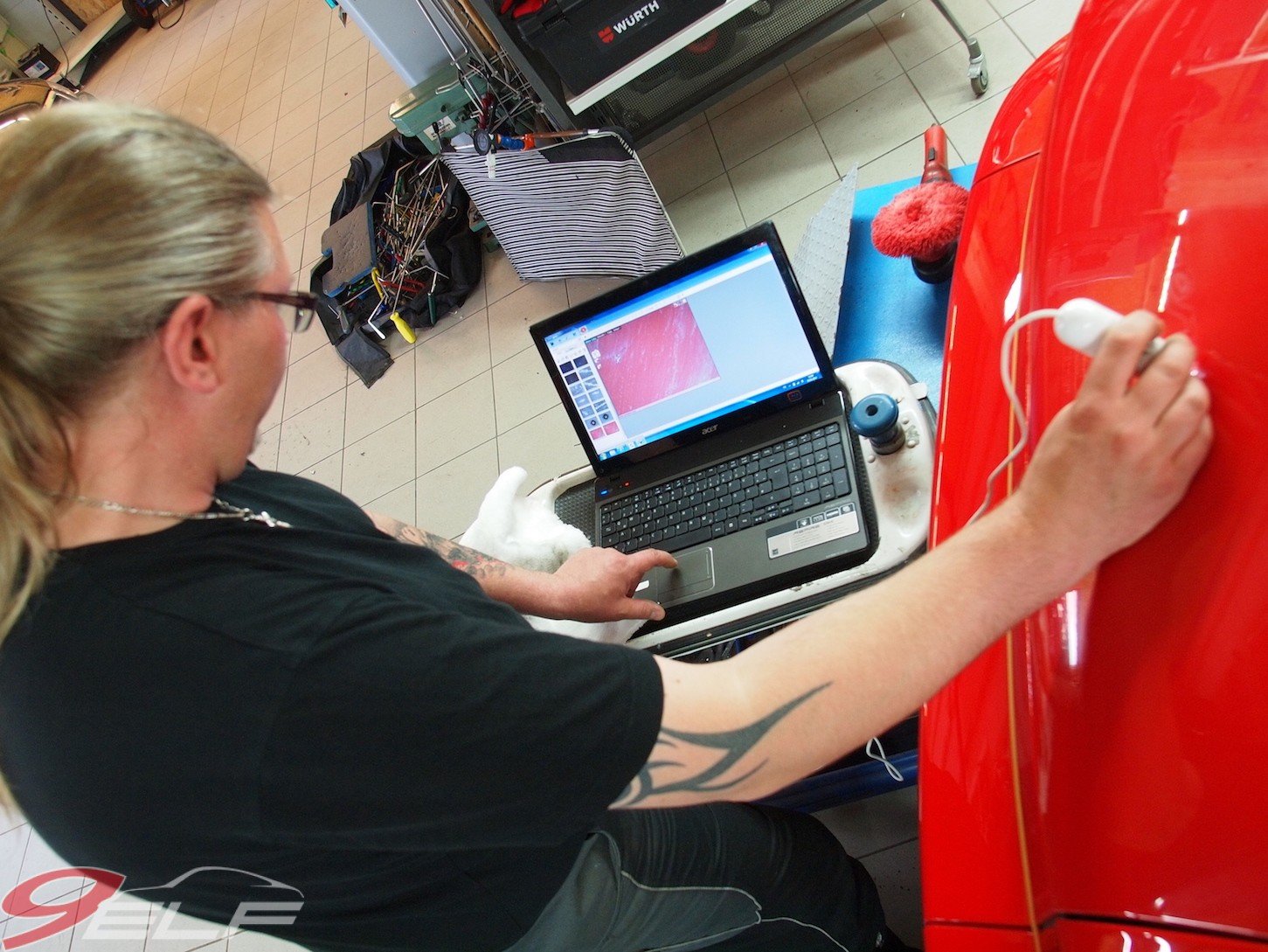 Polieren bedeutet für den Profi nicht einwachsen, sondern das Schleifen des Lackes durch ein Poliermittel mit leichter Körnung. Und genau dort beginnt auch das Problem für den Laien: Jeder Lack ist anders zu bewerten, was seine Beschaffenheit und sein Zustand angeht. Neue, Wasserbasierte Lacke verhalten sich beim Polieren anders als ältere Lacke auf Lösungsmittel-Basis. Und stark verwitterte Lacke benötigen eine andere Vorgehensweise als neuwertige. Verschiedene Poliermittel lassen sich mit unterschiedlichen Schleifpads und Schleiftellern kombinieren, die ebenfalls den Lackabtrag beeinflussen. Schleifpads und Politur müssen unbedingt zusammenpassen und dieses Wissen erfordert eben sehr viel Erfahrung. Sönke Hoffmann und seine Mitarbeiter erstellen vor Beginn der Arbeiten eine Diagnose mittels einer Tageslichtlampe und einer Lupenkamera und entwerfen danach einen „Schleifplan“. Festgestellt werden dabei „Hologramme“, das sind gleichgerichtete feinste Kratzer verursacht durch Bürsten oder Poliermaschinen, größere Kratzer („Spinnenweben“ durch Handwaschbürsten), Gebrauchskratzer (durch Sand, Vogelkot), sowie der allgemeine Grad der Mattierung. Anschließend wird der Stundenaufwand kalkuliert.