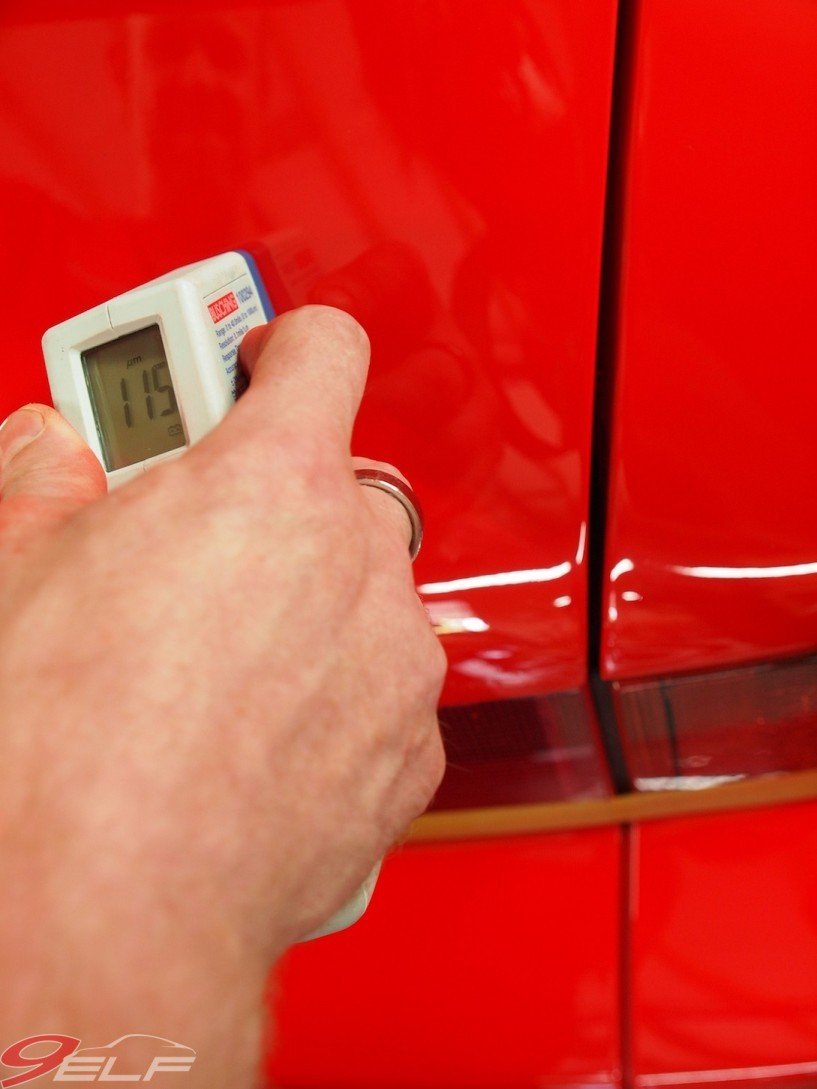 Nun wird ein Schleifweg gefunden, der möglichst viele Kratzer wegpoliert aber dabei möglichst viel Lack stehen lässt. „Mit zwei bis fünf Mikrometern Lackabrieb sollte man als Kompromiss zufrieden sein, damit man diesen Vorgang nach einigen Jahren wiederholen kann und der originale Lack möglichst lange erhalten bleibt“. Damit werden die wirklich tiefen Schrammen nicht beseitigt, diesen muss man sich dann anders widmen. Ein moderner Lack ist übrigens 60-80 Mikrometer stark, ein älterer Lack auch schon mal 120-160 Mikrometer. Nach der obligatorischen Lackdickenmessung mit einem entsprechenden Gerät kann Hoffmann abwägen, mit welcher Schleifpaste er beginnt. Mit jedem Schleifgang wird die Paste feinkörniger, bis die letzte Paste dem Lack bereits einen beträchtlichen Glanz verleiht. Jede der verwendeten Pasten hat ihre eigene Charakteristik hinsichtlich Abrieb und Glanz. Auch zwischendurch wird die Lackdicke geprüft, um nicht zu viel Material wegzunehmen.