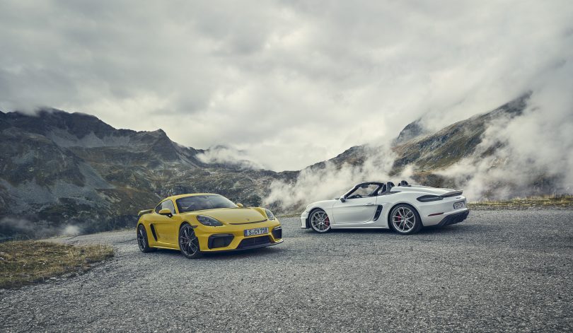 Gemeinsames Herzstück beider Modelle ist der neue Vierliter-Sechszylinder-Boxer. Der Saugmotor basiert auf der gleichen Motorenfamilie wie die Turbo-Triebwerke der aktuellen 911 Carrera-Baureihe. Das neue Hochdrehzahl-Aggregat leistet 420 PS (309 kW) – 35 PS mehr als im GT4-Vorgängermodell. Die dritte Generation des Spyder legt sogar um 45 PS zu. Das maximale Drehmoment von 420 Newtonmeter steht von 5.000 bis 6.800/min zur Verfügung. Die handgeschalteten Sportwagen durchbrechen beide die 300-km/h-Schallmauer: Der 718 Spyder ist 301 km/h schnell, der 718 Cayman GT4 erreicht 304 km/h. Beide Modelle beschleunigen in 4,4 Sekunden aus dem Stand auf 100 km/h. Der korrelierte Kraftstoffverbrauch der Mittelmotor-Sportler gemäß NEFZ beträgt 10,9 l/100 km.