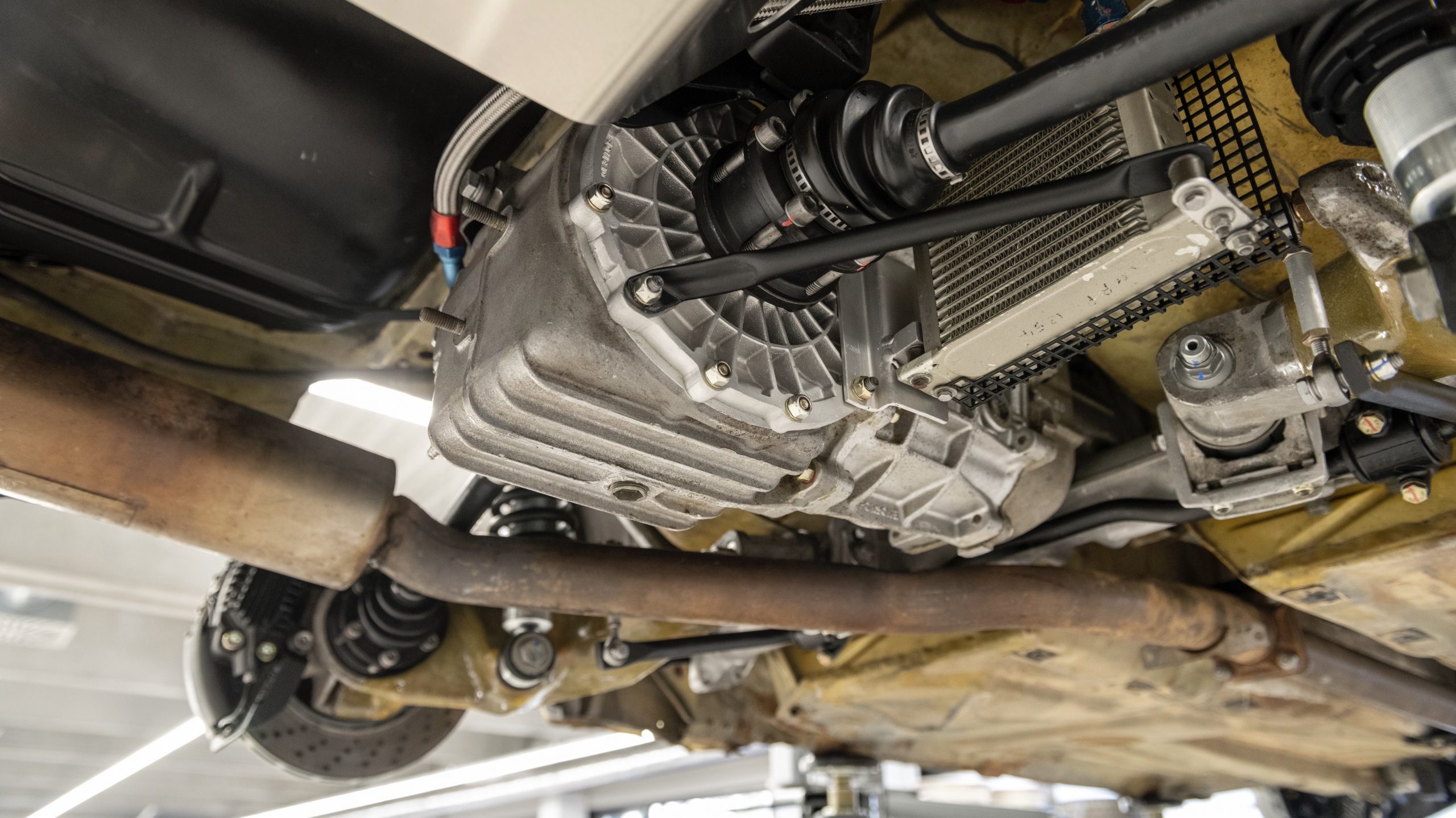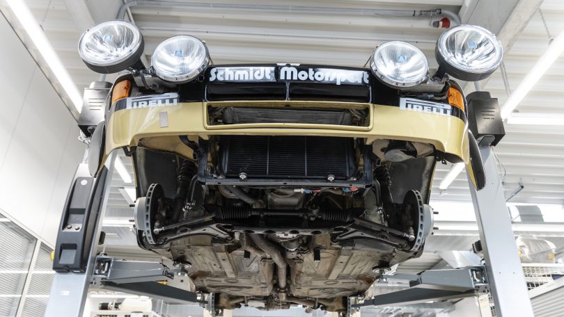 Bis auf Verschleißteile, einige Komponenten des Fahrwerks und das System der Benzinversorgung wurden bei der Restaurierung ausnahmslos vorhandene Bauteile überholt, revidiert und erneut verbaut – von den originalen 911-Turbo-Bremssätteln bis hin zum Ladeluftkühler mit dem noch von Hand geschweißten Gehäuse. Eine Endoskopie des Motors sowie des angeschlossenen KKK 26-Turboladers blieb ohne Befund, das Getriebe wurde sicherheitshalber zerlegt und geprüft, zeigte aber kaum Verschleiß. Und tatsächlich: Eine Rennkupplung zum Komplettieren des Antriebs hatte die Werkstatt des Porsche-Museums auf Lager, einen Satz Reifen im Format 255/55 R15 mit dem zeitgenössischen Profil fand sich beim Zulieferer Pirelli.