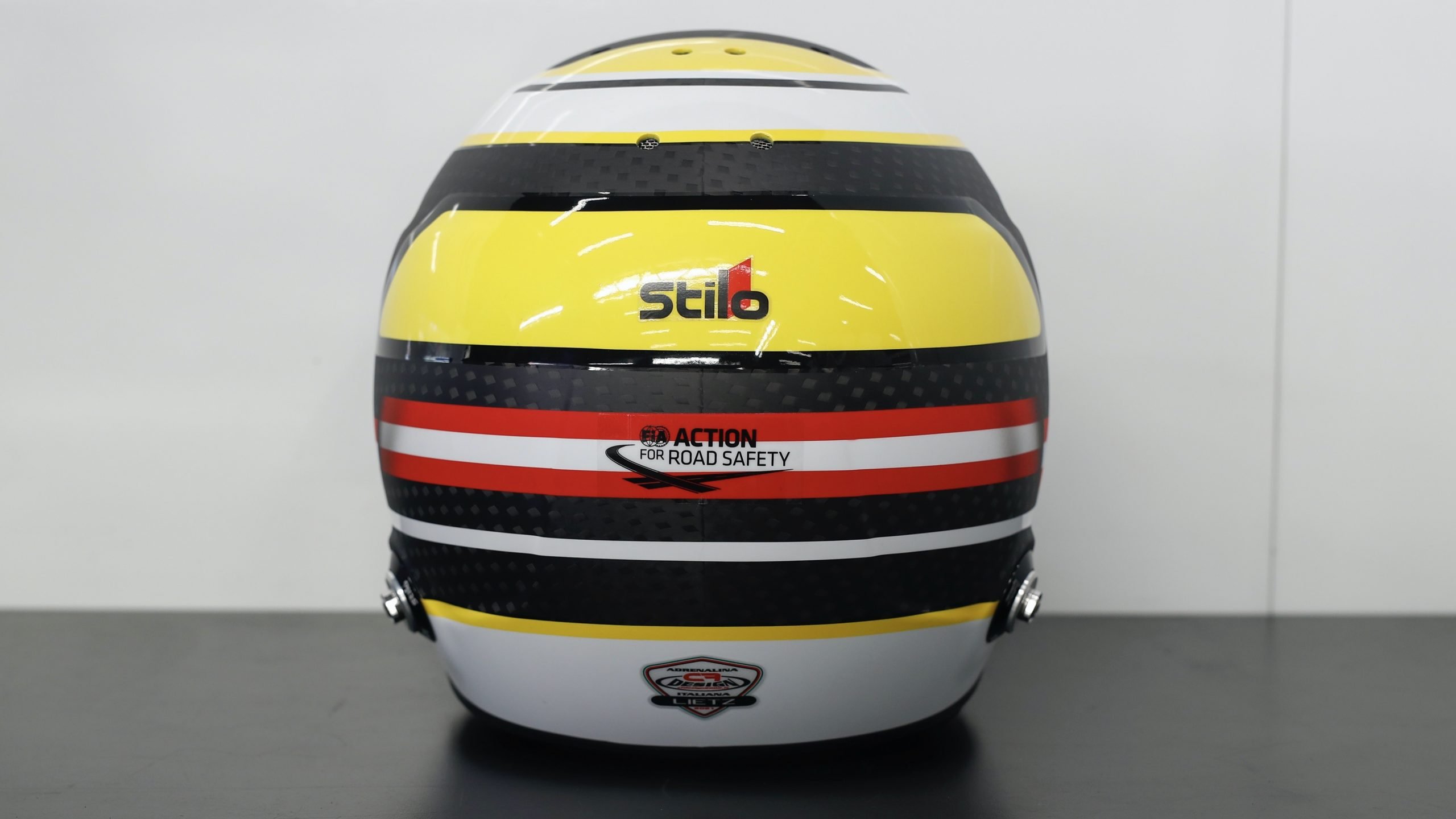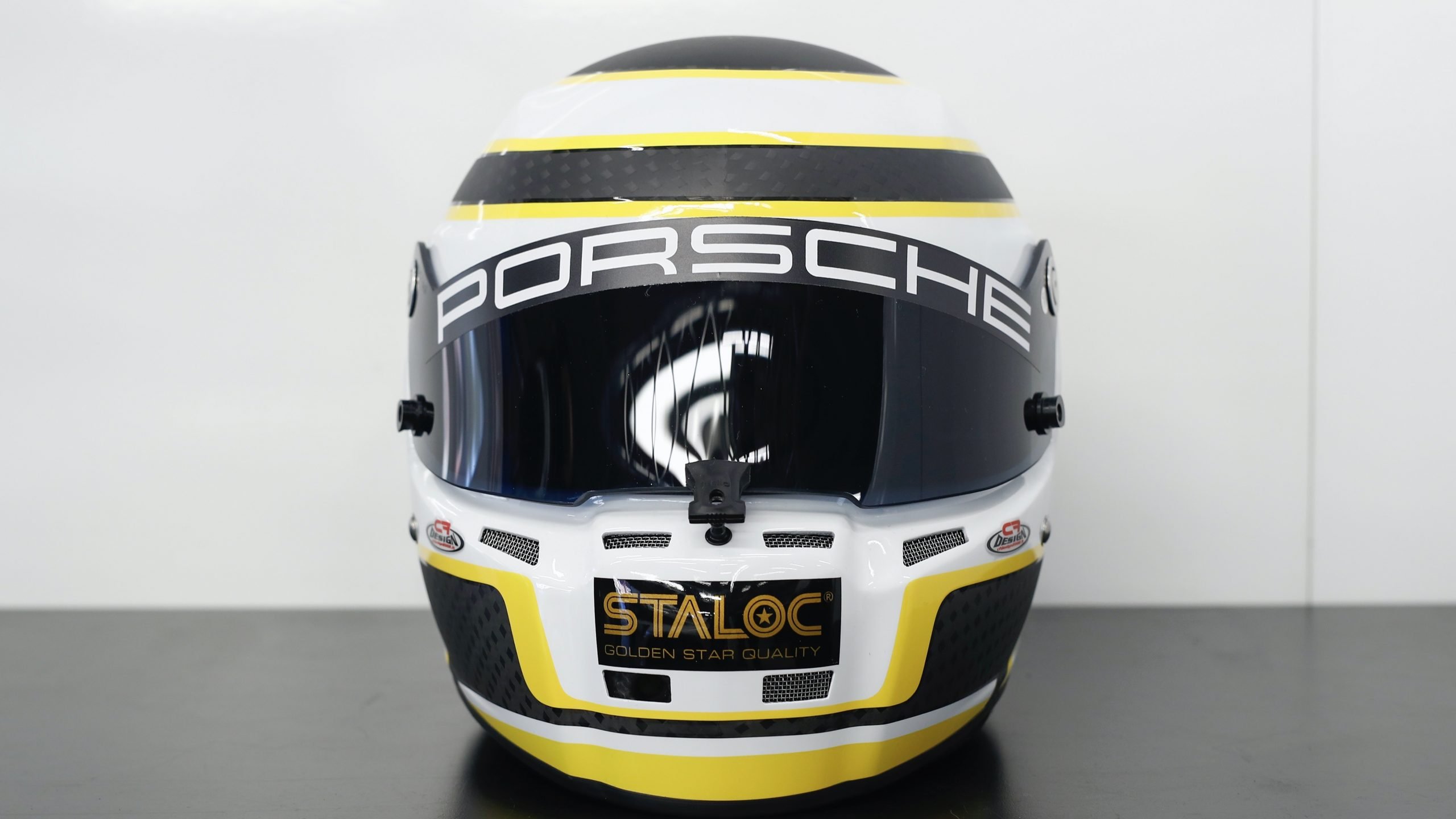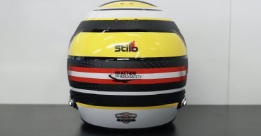 Viel Gelb und Schwarz, etwas Weiß und Rot – das Design des Helms von Richard Lietz ist von klassischer Art. Von oben betrachtet zeigen sich unterschiedlich breite Ringe in der entsprechenden Farbgebung. „Ich bin kein Fan von allzu aggressiven Designs“, sagt der Liebhaber von Architektur und Design. „Der neueste Entwurf, der sich nur leicht vom vorherigen Helm unterscheidet, ist ein Werk des italienischen Studios CF Design. Diese Firma habe ich durch meinen Teamkollegen Gimmi kennengelernt. Die Arbeiten gefallen mir, sie passen zu meinem Charakter und zu meinen Wünschen bezüglich des Outfits.“