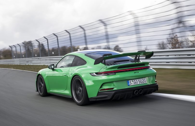 Auch für das erfreuliche Gewichtsniveau sind Rennsportanleihen verantwortlich. Etwa die Fronthaube aus kohlefaserverstärktem Kunststoff, Leichtbau-Glasscheiben, optimierte Bremsscheiben und geschmiedete Leichtmetallräder. Gleich zehn Kilogramm spart die Leichtbau-Sportabgasanlage ein. 1.435 Kilogramm bringt der neue GT3 auf die Waage. Wer es besonders puristisch mag, kann ein Sechsgang-Schaltgetriebe ordern und weitere 17 Kilogramm einsparen. Zusätzliche Optionen zur Gewichtsoptimierung sind Komponenten wie das Dach aus Sichtcarbon.