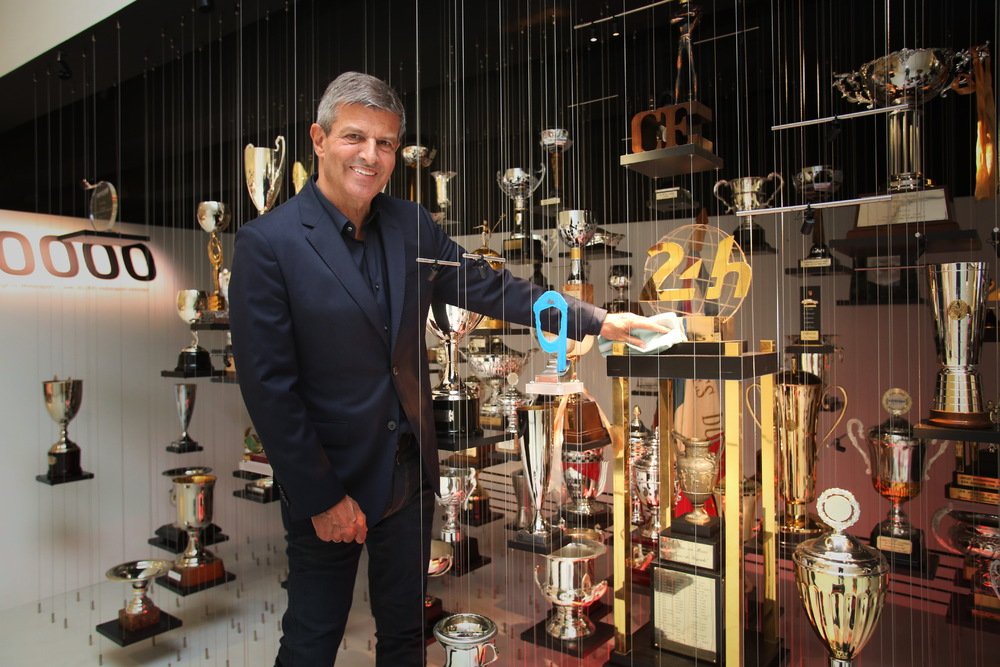 Fritz Enzinger mit dem Le-Mans-Siegerpokal im Porsche Museum